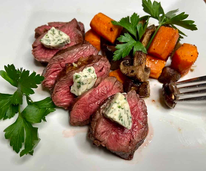 - Add a couple slices of garlic herb compound butter on top of the steak. If you have some parsley handy, add some to make the plate look pretty.